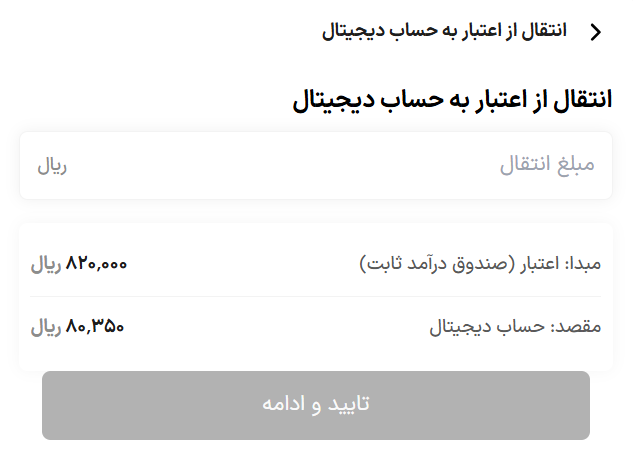 در بخش انتقال وجه، با انتخاب گزینه انتقال از اعتبار به حساب دیجیتال میتوانید اعتبار (موجودی صندوق درآمد ثابت) خود را تا سقف 200 میلیون تومان در روز به حساب دیجیتال منتقل کنید.