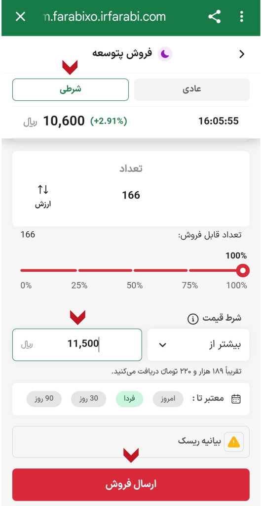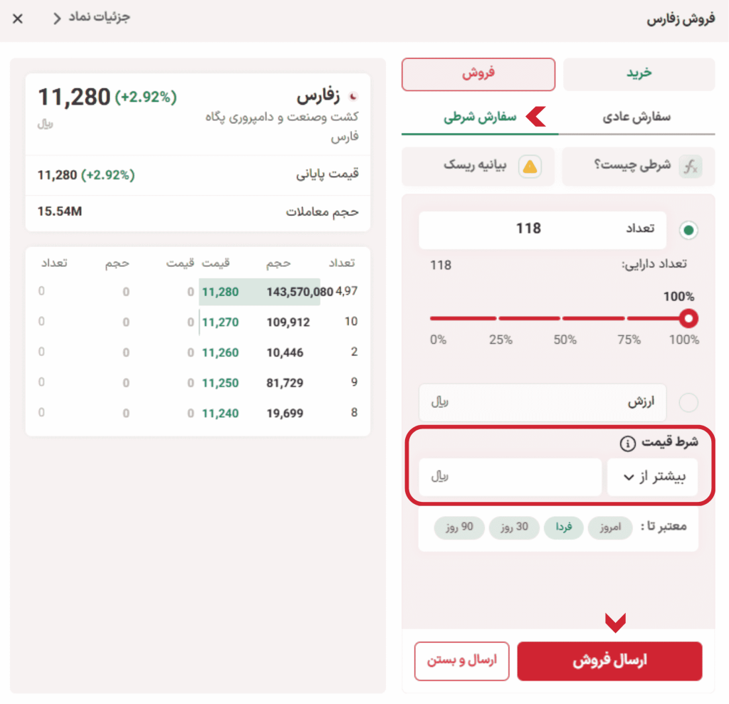 شما میتوانید سفارش فروش خود را بهصورت شرطی ثبت کنید تا در صورت رسیدن قیمت سهم به ارزش موردنظر، معامله بهصورت خودکار انجام شود. برای این کار در صفحه نماد مورد نظر ابتدا سربرگ شرطی را انتخاب کنید. بهعنوان مثال، میتوانید قیمت مورد نظر خود را 15 درصد بالاتر از قیمت روز عرضه تعیین کنید تا در صورتی که قیمت سهم به بالاتر از مقدار مشخصشده رسید، سفارش فروش شما بهصورت خودکار ارسال شود.