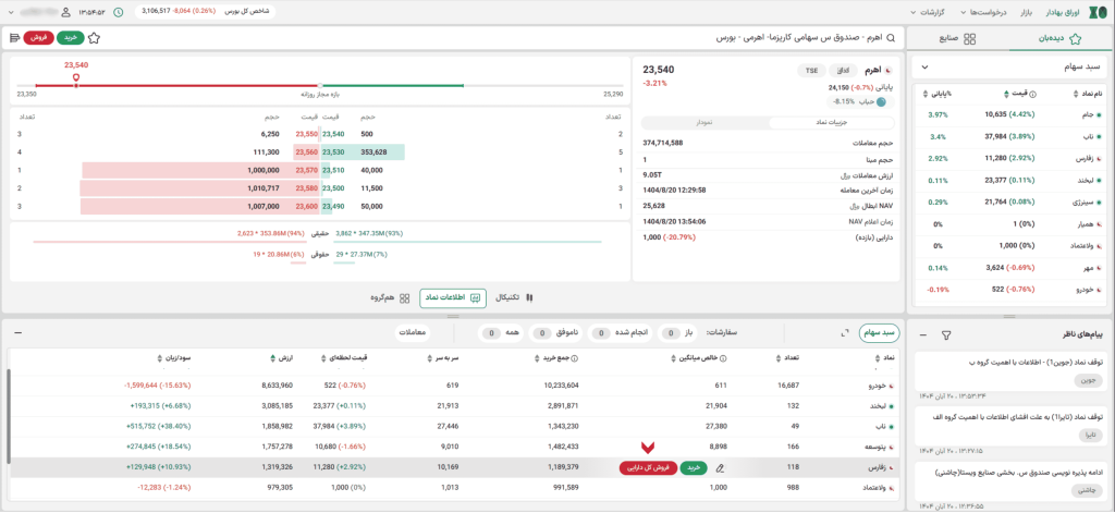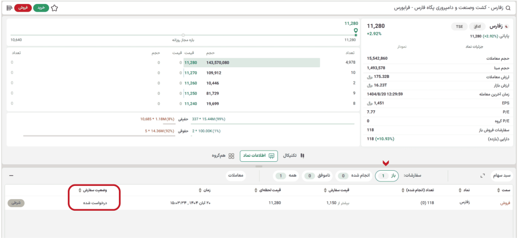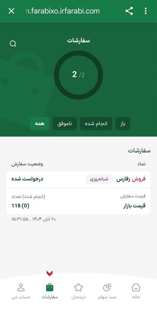 در نهایت با انتخاب گزینه «ارسال فروش»، درخواست شما در سامانه ثبت میشود و میتوانید وضعیت آن را در بخش سفارشات مشاهده کنید.