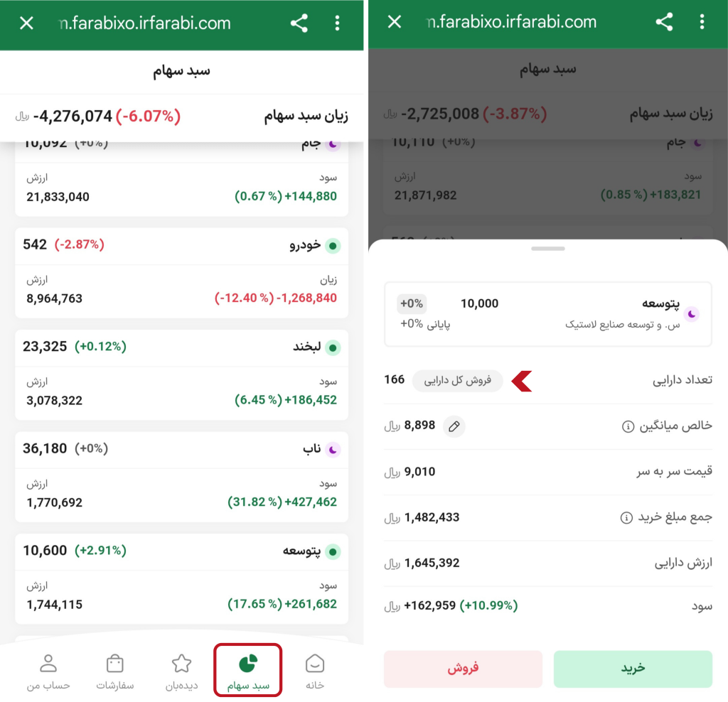 شما میتوانید از شنبه تا چهارشنبه، در بازه زمانی 09:00 تا 12:30 (به جز تعطیلات رسمی)، سفارش فروش سهام خود را به صورت آنلاین ثبت کنید. برای فروش سهام از طریق تلفن همراه، پس از ورود به حساب کاربری، از بخش سبد سهام نماد مورد نظر خود را انتخاب کرده و روی گزینه فروش کل دارایی کلیک کنید.