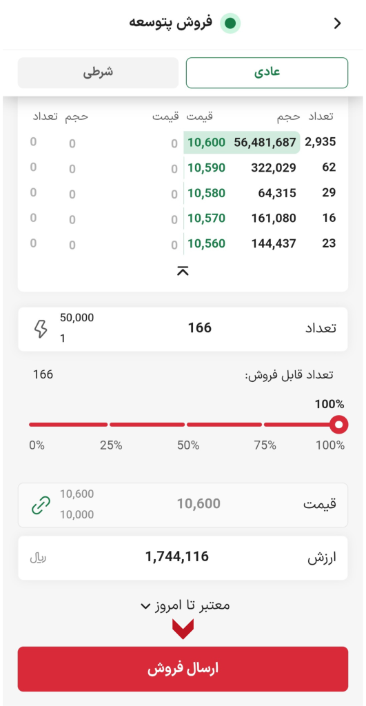در صورتیکه تمایل به ثبت سفارش فروش در بازه زمانی خارج از زمان معاملات دارید، ابتدا نماد مورد نظر و سپس گزینه «فروش کل دارایی» را انتخاب کنید. در بخش قیمت، مبلغ دلخواه خود را وارد کرده و نوار درصد را روی ۱۰۰٪ تنظیم کنید. همچنین میتوانید گزینه قیمت دلخواه را به قیمت بازار تغییر دهید تا سفارش شما در اولین روز معاملاتی بعد، با بهترین قیمت بازار ارسال شود. در نهایت با انتخاب گزینه ارسال فروش سفارش در سامانه ثبت میشود.