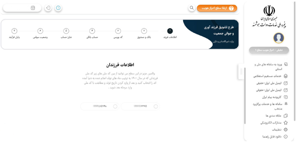 ۳- وارد کردن اطلاعات فرزند برای دریافت سهام نوزادان