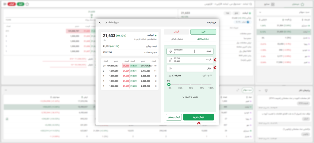 در پنجره سفارش باز شده با وارد کردن مبلغ مورد نظر و قیمت، تعداد سهم به طور خودکار محاسبه می‌شود. با انتخاب گزینه ارسال خرید، سفارش شما به هسته معاملات ارسال می‌شود.