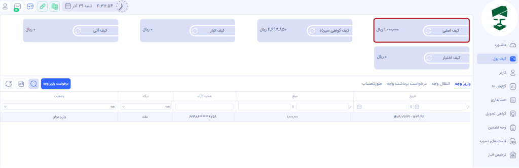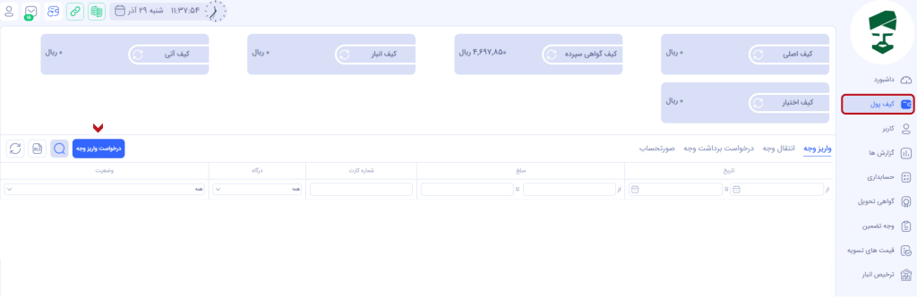 1. از قسمت کیف پول گزینه درخواست واریز وجه را انتخاب کنید.