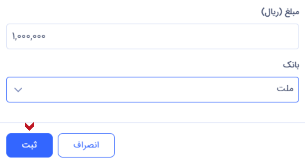 2. در پنجره باز شده مبلغ و درگاه بانکی را انتخاب کرده و بر روی ثبت کلیک کنید.