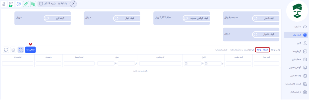 4. برای خرید گواهی سپرده شمش نقره، لازم است ابتدا مبلغ مورد نظر از کیف اصلی به کیف گواهی سپرده منتقل شود. برای انجام این کار، مطابق تصویر، ابتدا وارد سربرگ انتقال وجه شده و سپس گزینه انتقال وجه را انتخاب نمایید.