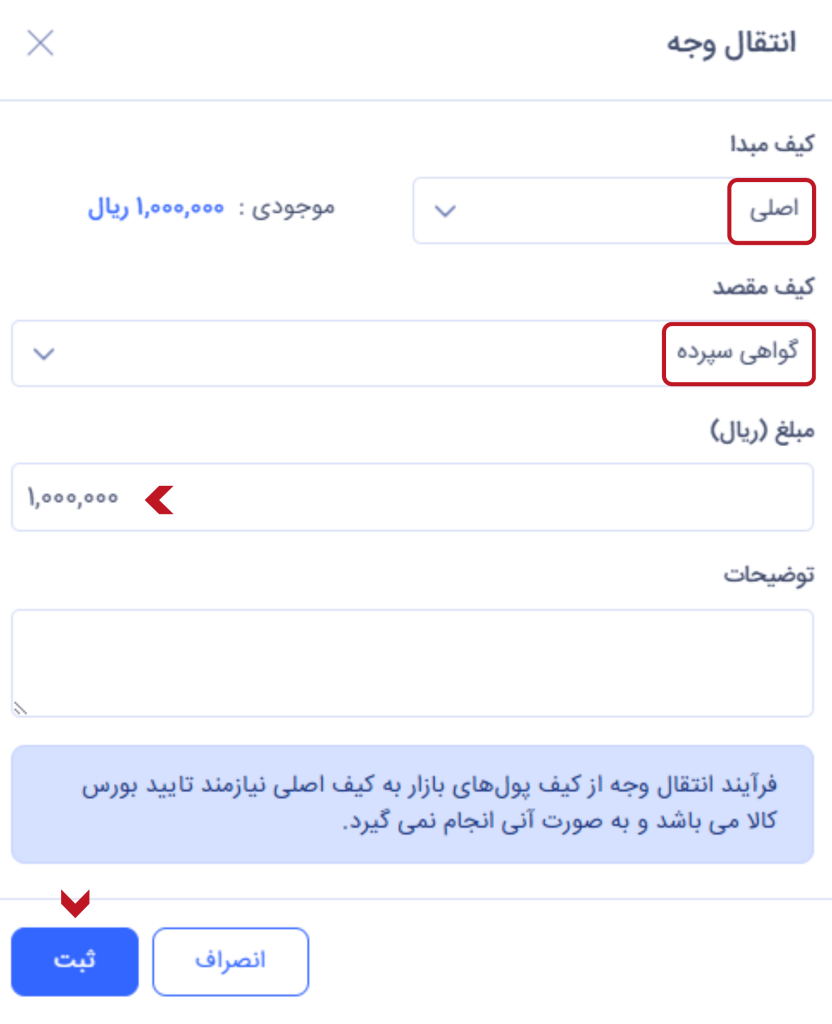 5. در پنجره باز شده کیف مبدا را بر روی اصلی و کیف مقصد را بر روی گواهی سپرده انتخاب نموده و پس از وارد کردن مبلغ بر روی ثبت کلیک کنید.
