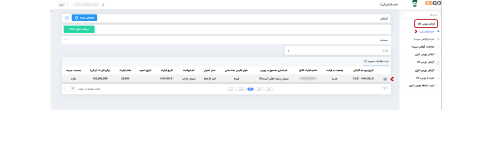 پس از تکمیل وجه در حساب وکالتی و بارگذاری فیش مالیات، در سامانه ایبیگو از بخش کارتابل بورس کالا، گزینه خریدار (فیزیکی) را انتخاب نموده و روی علامت چشم کلیک کنید تا وارد صفحه اسناد شوید.