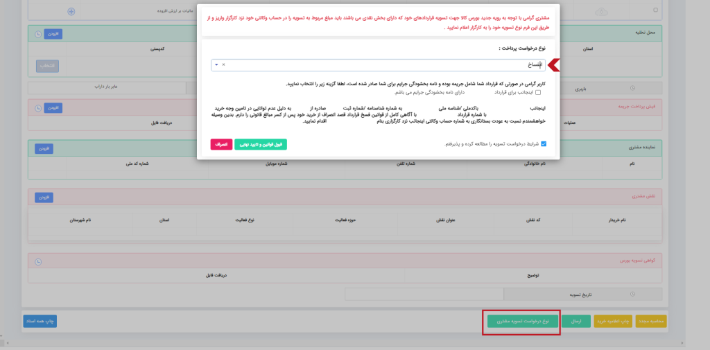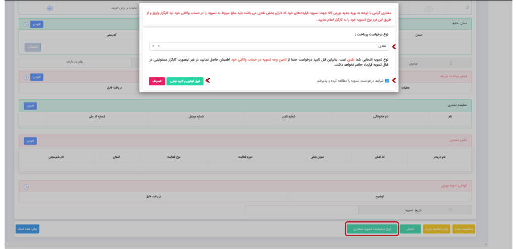 در پایین صفحه پیشرو گزینه نوع درخواست تسویه مشتری را انتخاب کنید، در پنجره باز شده نوع درخواست پرداخت را روی حالت نقدی قرار دهید. در پایان لازم است شرایط و قوانین تسویه را پذیرفته و روی گزینه قبول قوانین و تایید نهایی کلیک کنید.