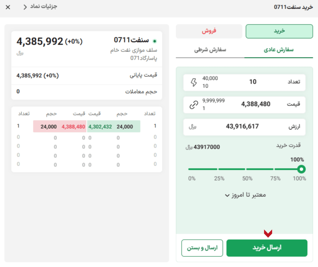 با تعیین تعداد قرارداد و قیمت مد نظر، سفارش خرید خود را ثبت کنید.