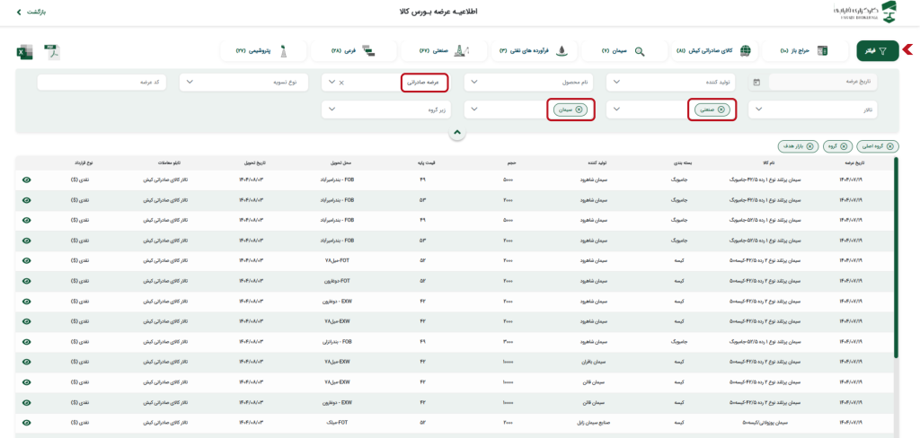 در این مرحله، خریدار باید اطلاعیه عرضه مربوط به سیمان صادراتی موردنظر را بررسی کند. این اطلاعیه را میتوان به دو روش مشاهده کرد. روش اول از طریق سایت رسمی بورس کالای ایران است؛ پس از ورود به این سایت کافیست از منوی بازارها و از بخش بازار فیزیکی بر روی گزینه اطلاعیه عرضه صادراتی کلیک کنید. روش دوم، مراجعه به سایت ایبیگوی کارگزاری فارابی است که با انتخاب گزینه اطلاعیه عرضه بورس کالا و استفاده از فیلترهای مربوط به سیمان صادراتی، میتوان جزئیات عرضه موردنظر را مشاهده کرد.