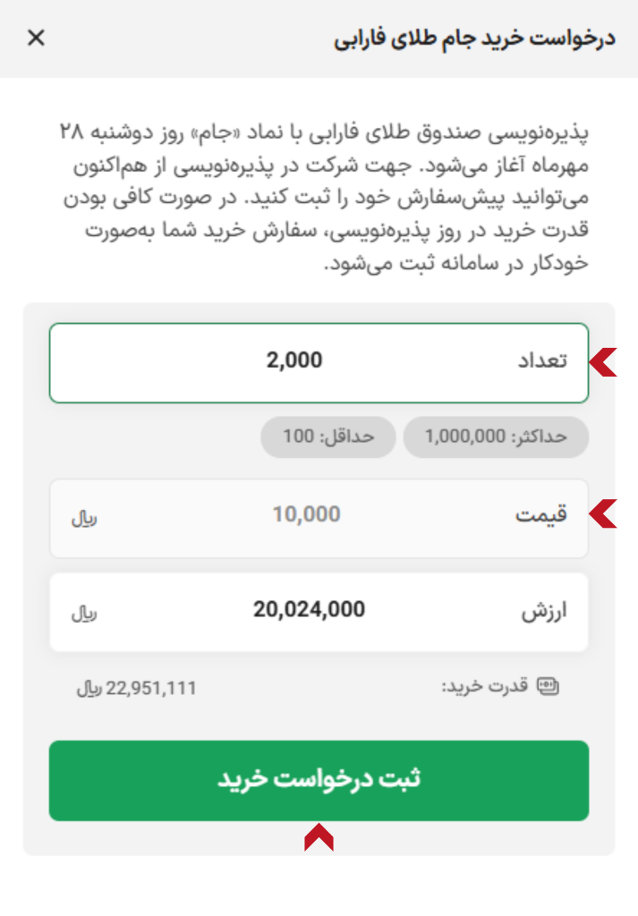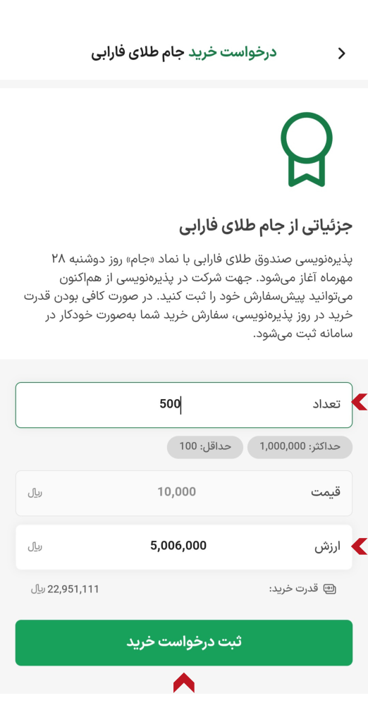 ثبت سفارش خرید: تعداد واحدهای مورد نظر را وارد کرده و سپس روی گزینه “ثبت درخواست خرید” کلیک کنید.