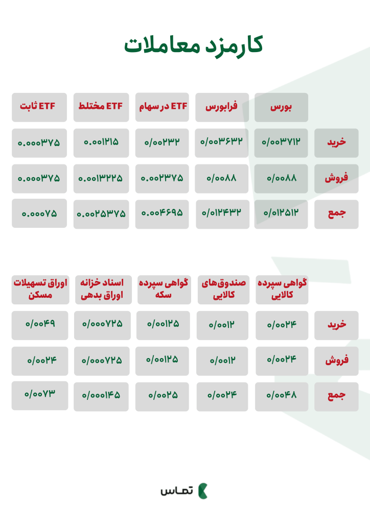 تمامی معاملات در بازار سرمایه ایران مطابق با نرخ تعیین شده توسط اداره نظارت بر بورسها شامل کارمزد است، در جدول زیر کارمزد مصوب سازمان قابل بررسی است.